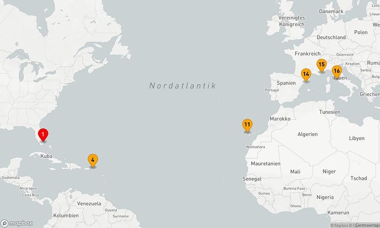 Während der Route halten Sie unter anderem in den Häfen von Miami, Road Town und Barcelona, um in das Flair und die Besonderheiten der Umgebung einzutauchen.
