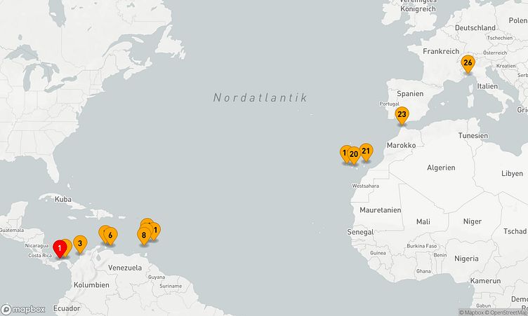 Nach Ihrem Start am 23. November 2026 in Colón (Panama) führt Sie die Route über 25 Tage bis zu Ihrem Zielhafen Savona (Italien), wo Sie am 18. Dezember 2026 ankommen.