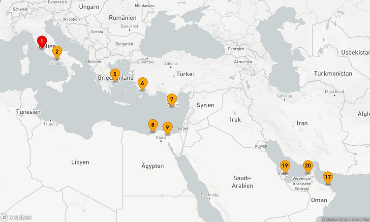 Von Rom / Civitavecchia (Italien) aus starten Sie am 21. November 2027 und erreichen nach 20 Tagen den Zielhafen Dubai (Vereinigte Arabische Emirate), wo Ihre Reise ihren Abschluss findet.