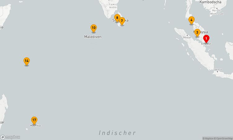Ihre Reise startet in Singapur (Singapur). Am 27. April 2027 legen Sie ab und erreichen nach 16 Tagen, am 13. Mai 2027, den Zielhafen Port Louis (Mauritius).