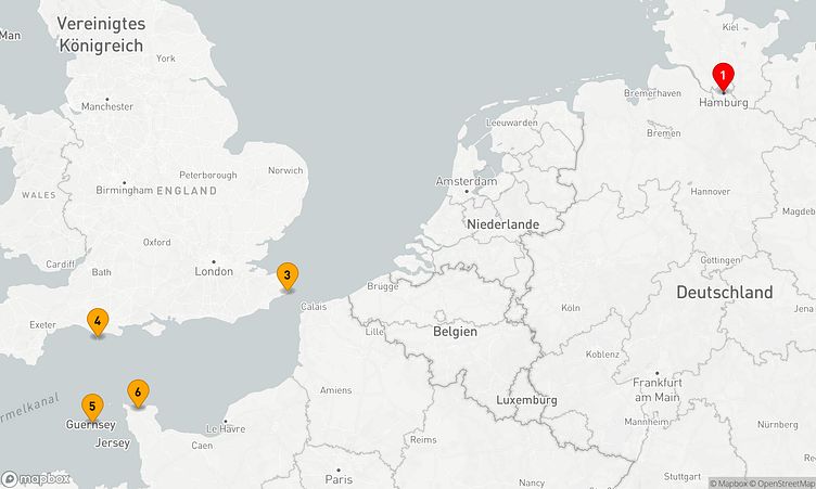 Auf dieser Reise erwarten Sie Stopps in den Häfen von Hamburg, Dover und Saint Peter Port, wo Sie lokale Highlights und unvergessliche Eindrücke sammeln.