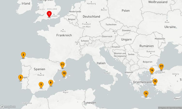 Die Reiseroute beginnt am 24. April 2026 in Southampton (Vereinigtes Königreich) und führt Sie vom 24. April 2026 bis zum 11. Mai 2026 (17 Tage) nach Istanbul (Türkei).