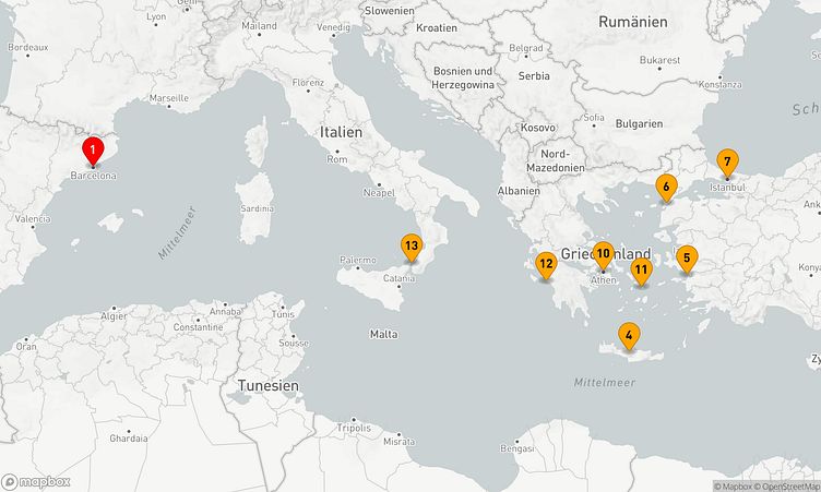 Auf Ihrer Reise besuchen Sie unter anderem die Häfen von Barcelona, Kusadasi und Istanbul, wo spannende Eindrücke von Land und Kultur auf Sie warten.