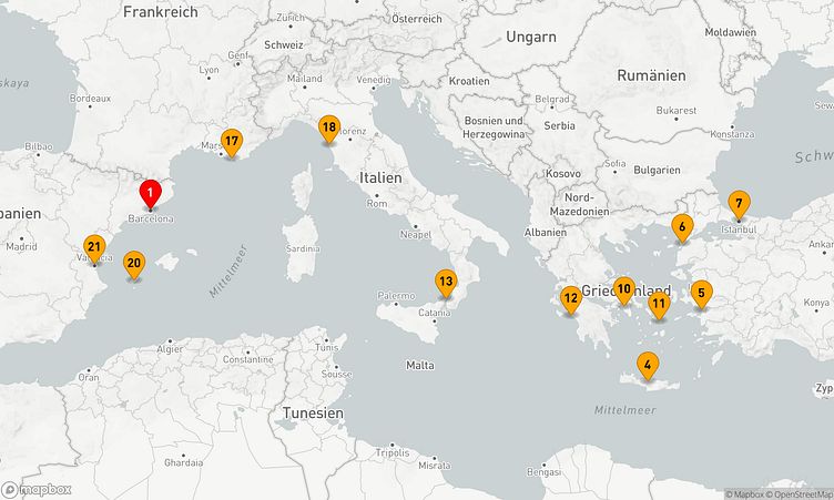 Auf Ihrer Reise besuchen Sie unter anderem die Häfen von Barcelona, Istanbul und Katakolon, wo spannende Eindrücke von Land und Kultur auf Sie warten.