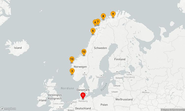 Während der Reise besuchen Sie unter anderem die Häfen von Hamburg, Bodø und Tromsø, die Ihnen spannende Eindrücke und einzigartige Entdeckungen bieten.