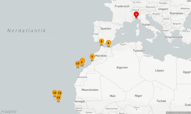 Ihre 16-tägige Reise beginnt am 13. November 2027 in Savona (Italien) und endet am 29. November 2027 im Hafen von Gran Canaria (Spanien).