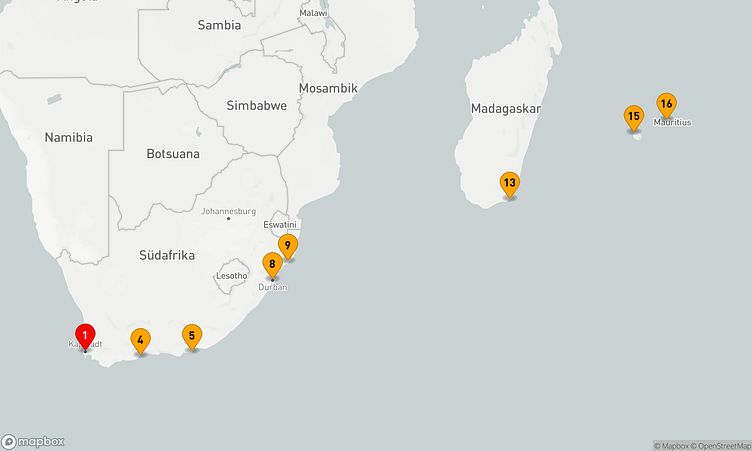 Ihre Route führt Sie unter anderem zu den faszinierenden Häfen von Kapstadt, Mossel Bay und Durban, wo Sie die lokale Atmosphäre und das lebendige Treiben vor Ort erleben können.