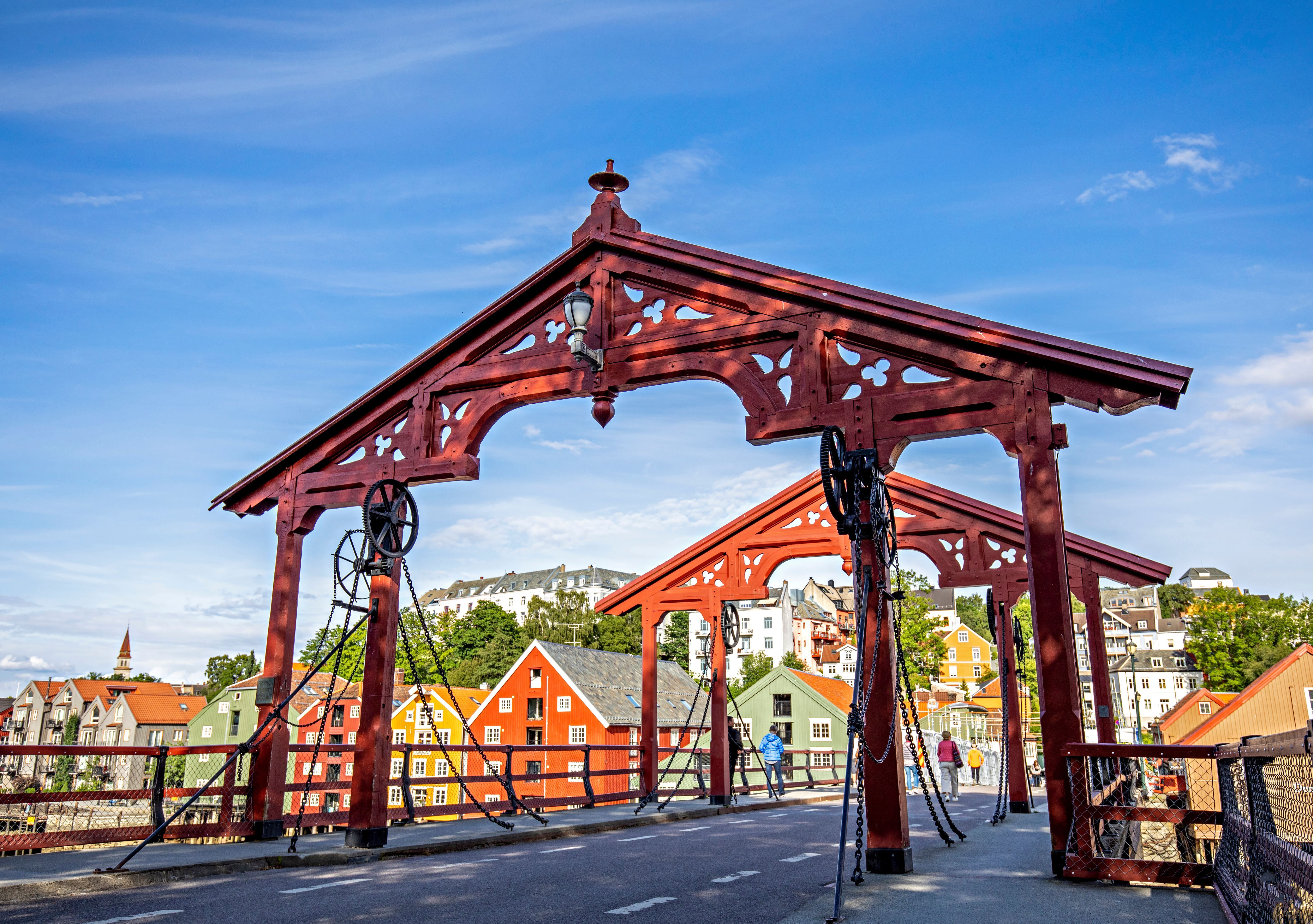 Ein weiteres Highlight ist die Stadtbrücke Gamle Bybro, die über den Fluss Nidelva führt. Die Brücke, oft als das Tor zur Stadt bezeichnet, verbindet das Stadtzentrum mit dem alten Stadtteil Bakklandet. Dieser Bereich ist bekannt für seine malerischen, bunten Holzhäuser und das lebhafte Straßenleben.